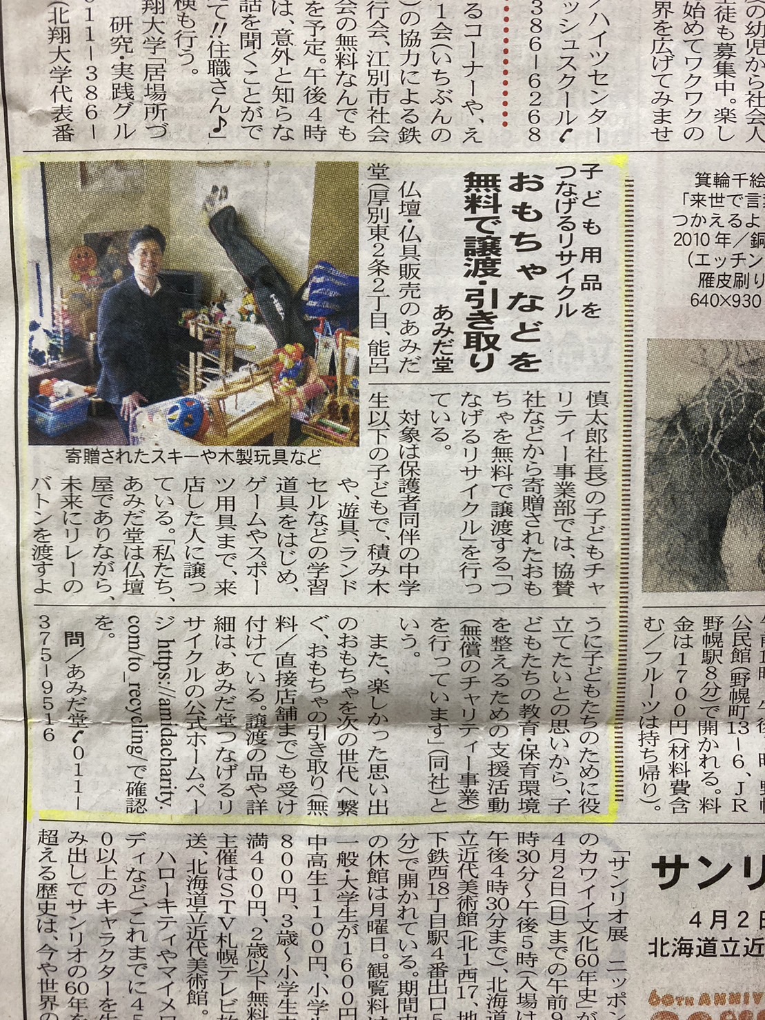 3月3日発行のまんまる新聞に掲載いただきました 2023/03/09 2023年3月3日発行のまんまる新聞に記事掲載いただきました。 (まんまる新聞…江別市、札幌市厚別区、清田区と北広島市の一部に無料配布している新聞。約110,000部発行) 【つなげるリサイクル】の活動にあたっての掲載になります。 ご覧いただけておりましたら幸いです。 前の記事 次の記事